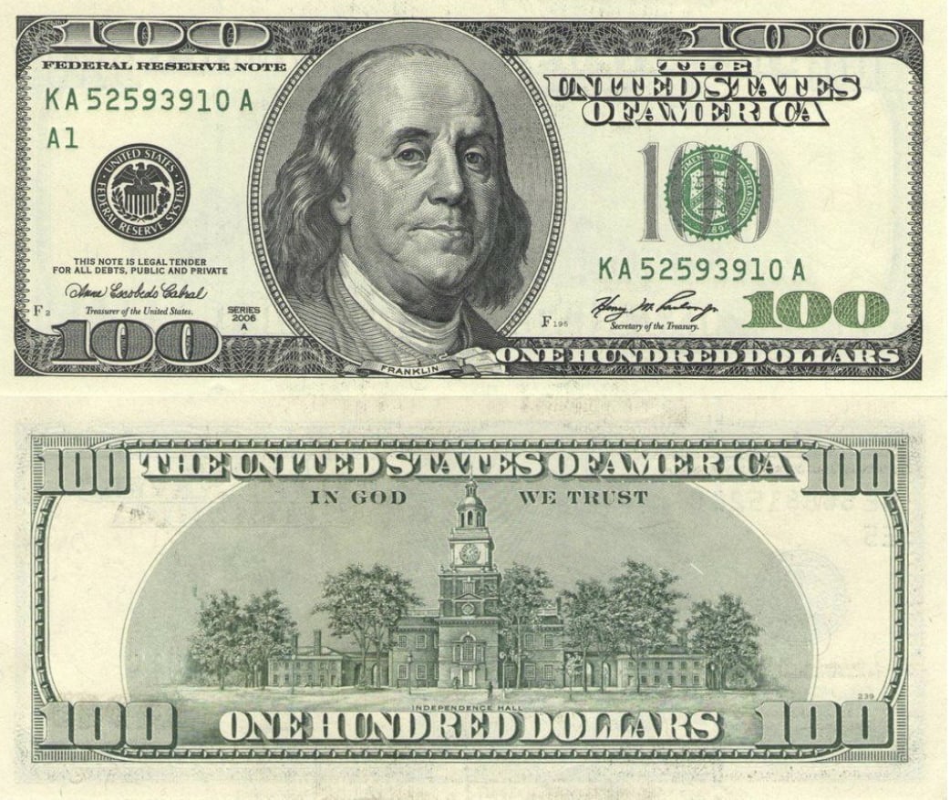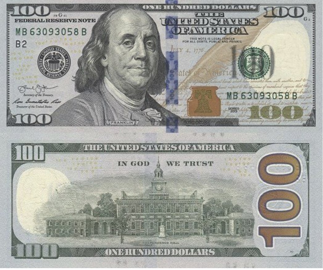 يستخدم 100 دولار أمريكي أيضًا ميزتين للأمن العام أصبحتا معايير صناعية. تمت طباعة Liberty Bell in an Ink Well بحبر متغير اللون. عندما تميل الورقة النقدية ، تتغير ألوان الحبر وينفجر الجرس. هذه الميزة سهلة التعرف عليها ويصعب تكرارها. كان 100 دولار أول ورقة نقدية أمريكية تستخدم الشريط الامني البلاستيكي الأزرق. يسمى هذا الخيط المضمن . تتم إضافة الخيط أثناء إنتاج الورق مما يجعل النسخ المتماثل أكثر صعوبة. الميزة نفسها فريدة ومثيرة للاهتمام لأنه عند إمالة الورقة النقدية ؛ مثلما فعلت لرؤية لون الحبر المتغير ، تتحرك الصور في الشريط الأزرق بشكل عمودي على الطريقة التي تحركها بها. يبدو أيضًا أن الصور - الجرس و "100" تختفي في الورق. يتوقع دماغك أن تتحرك الصور في نفس الاتجاه الذي تحركه فيه. نظرًا لأنه يتحرك في اتجاه مختلف ، فإن عقلك يستشعر الحركة غير العادية ويوليها مزيدًا من الاهتمام. هذا التأثير يجعل الميزة واضحة وفعالة للغاية.